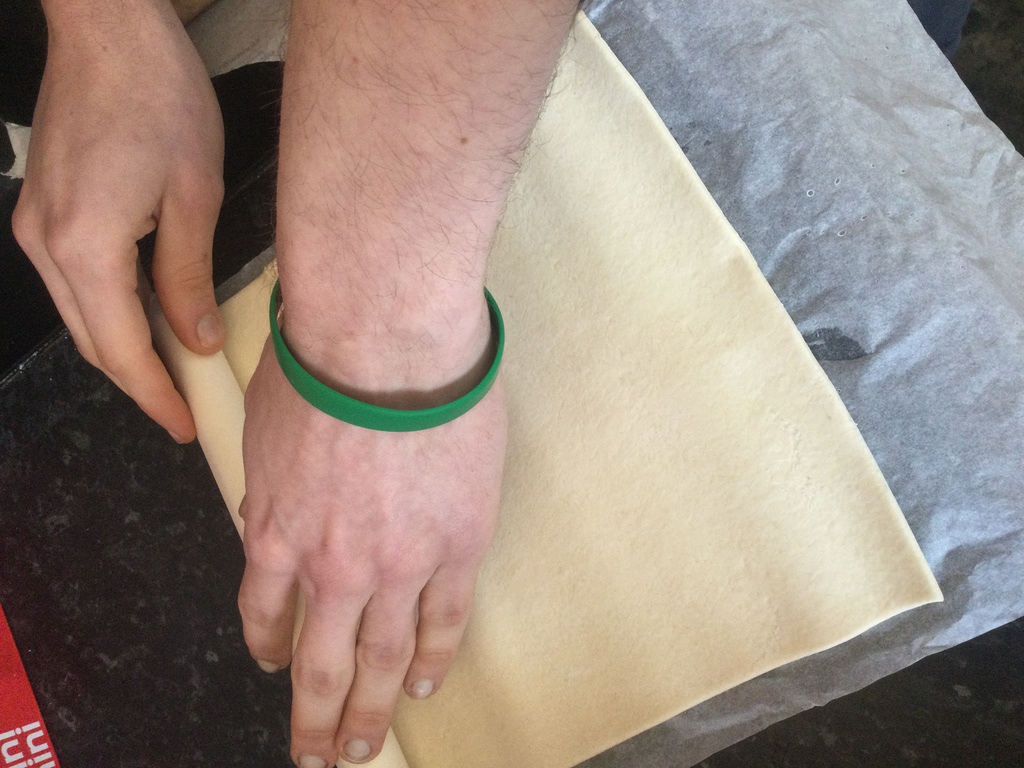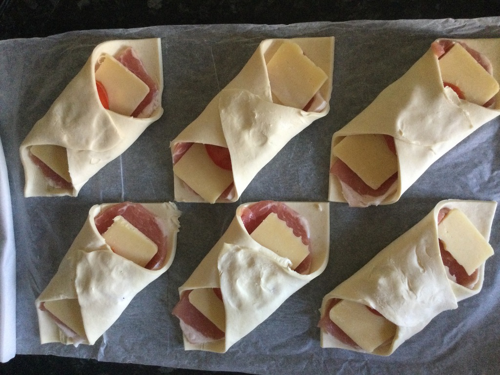 7. Put some grease proof paper on a backing tray and then the bacon and cheese turns.