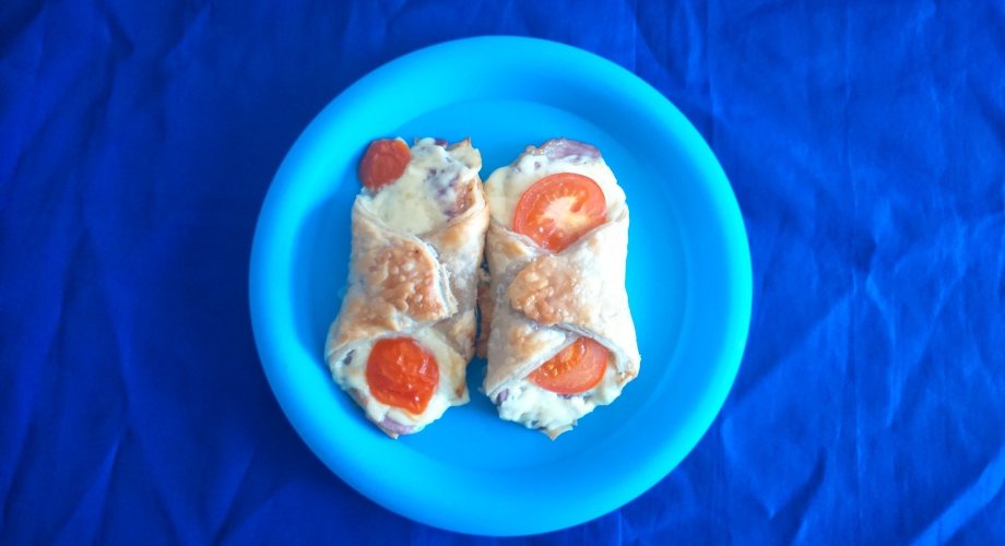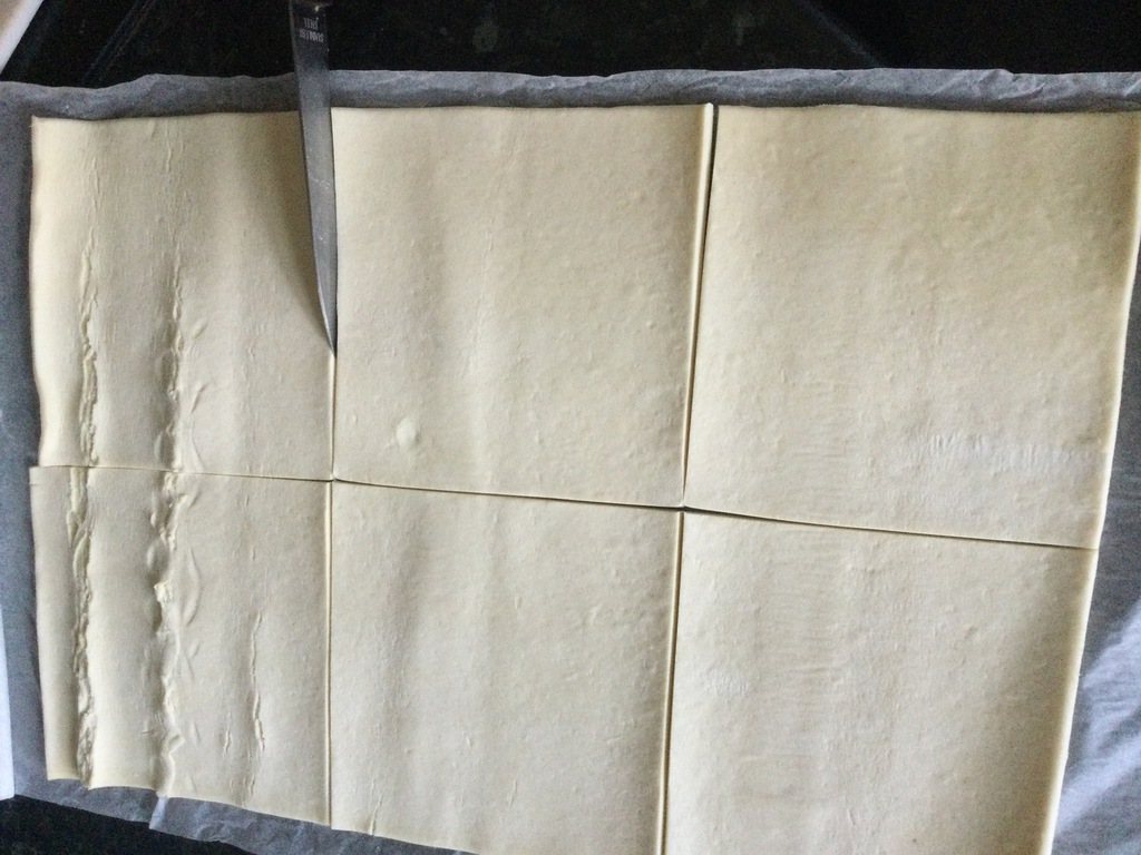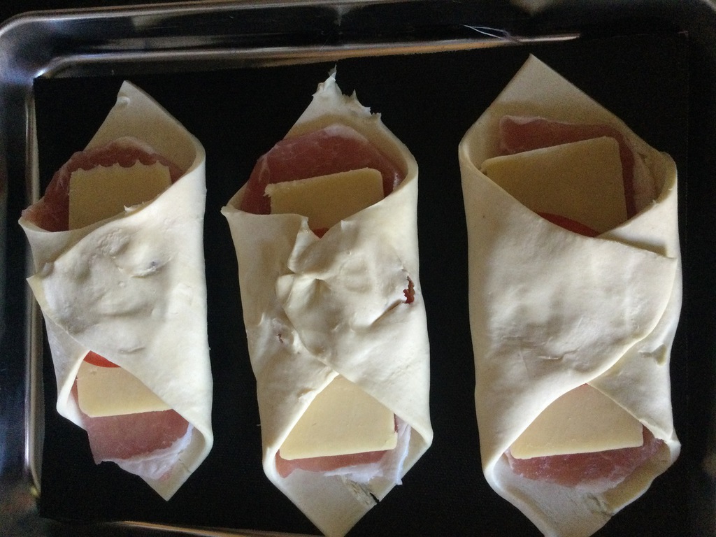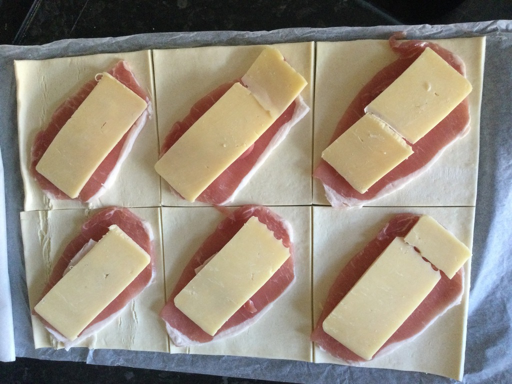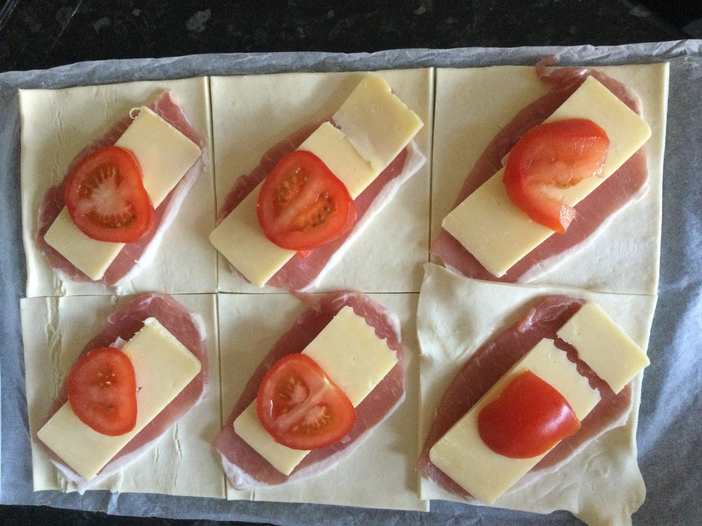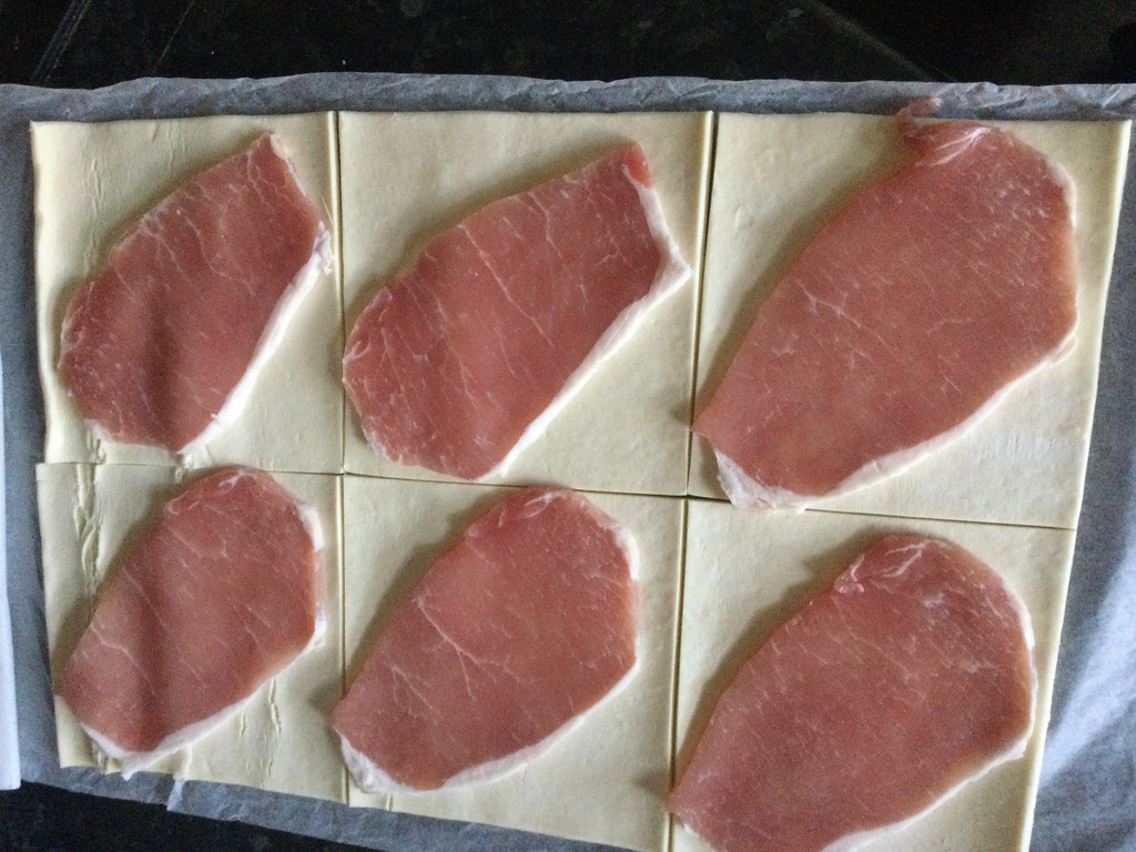 3. Put a piece of bacon diagonally on top of each square of pastry.