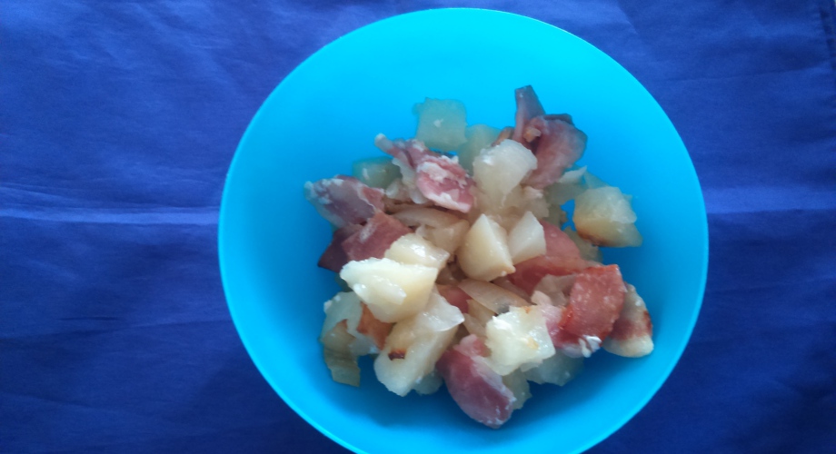5. Layer the cubes of potatoes on top and then the other half of the onion and bacon.