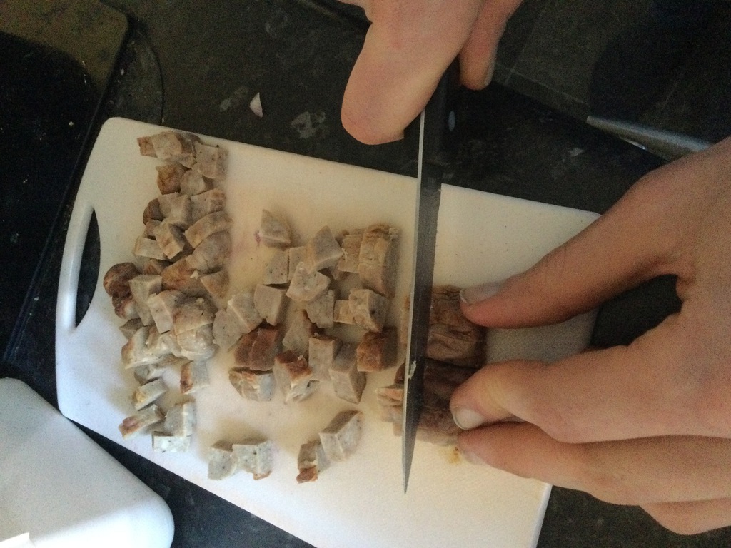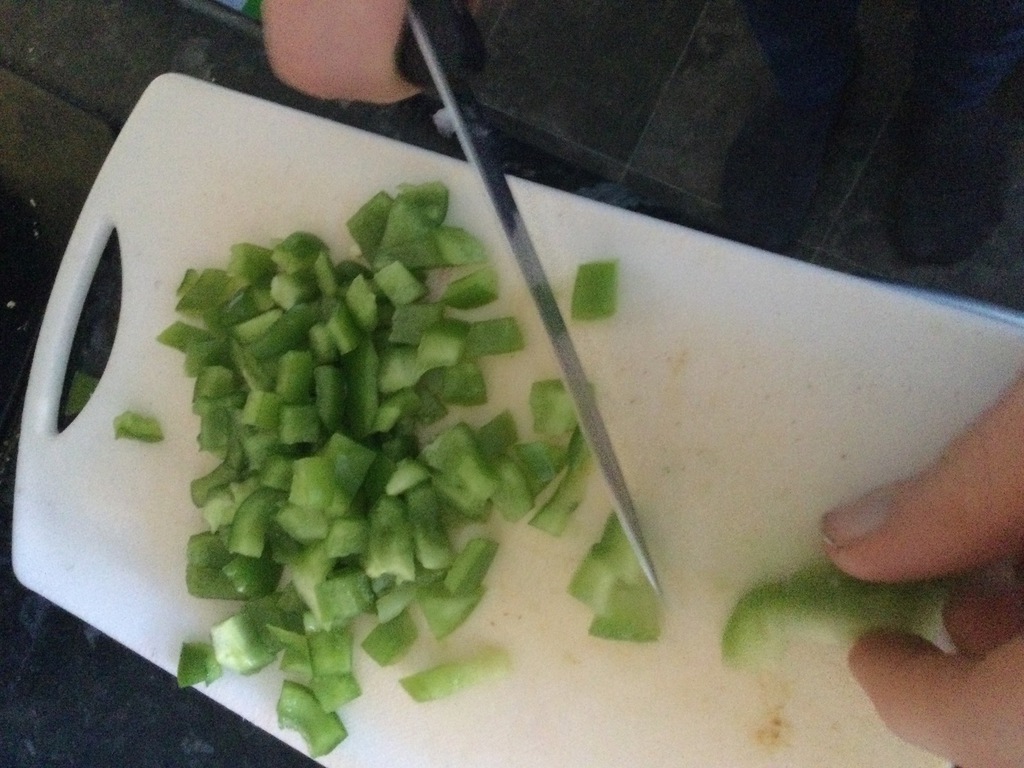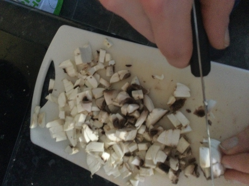 2. Slice the sausages, mushrooms and peppers into small chunks,