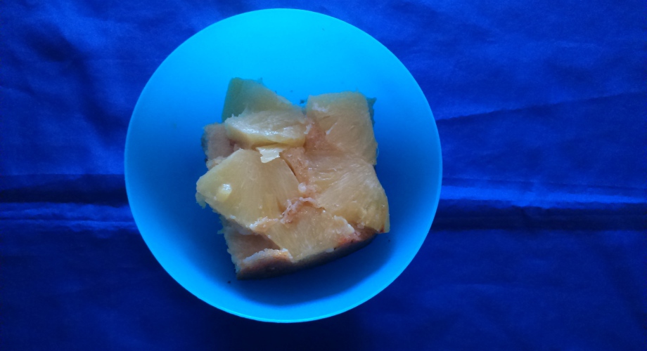 4. Put the pineapple in the bottom of a dish and spread the mixture over the top of the pineapple.